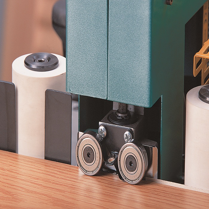 Obcinanie okleiny na równo z płytą po obu stronach panelu jednocześnie.