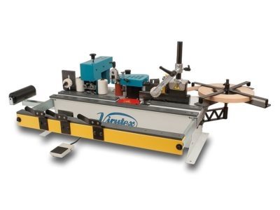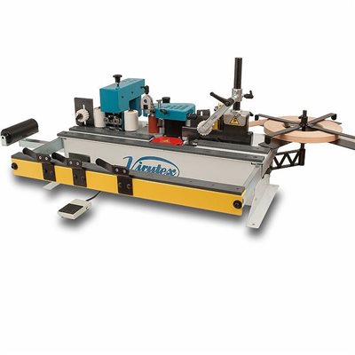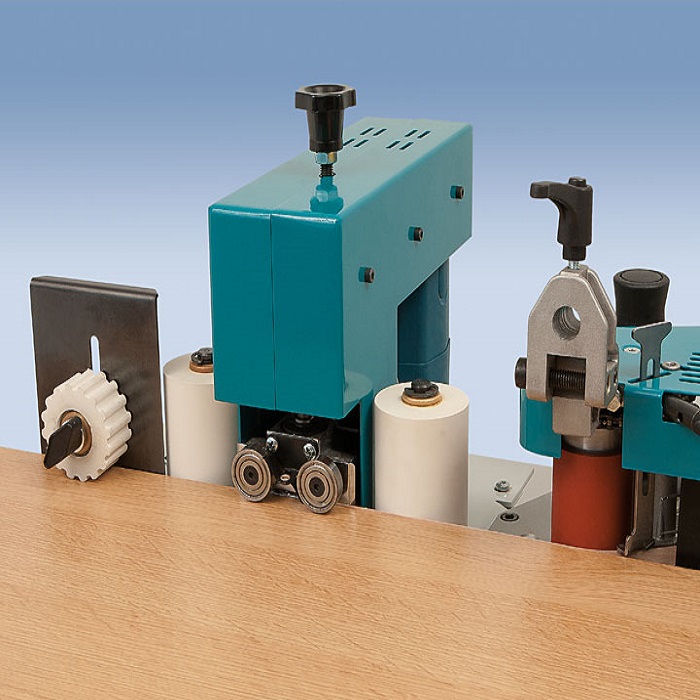 Posiada podajnik na rolkę obrzeża i automatyczną gilotynę tylną obrzeża.