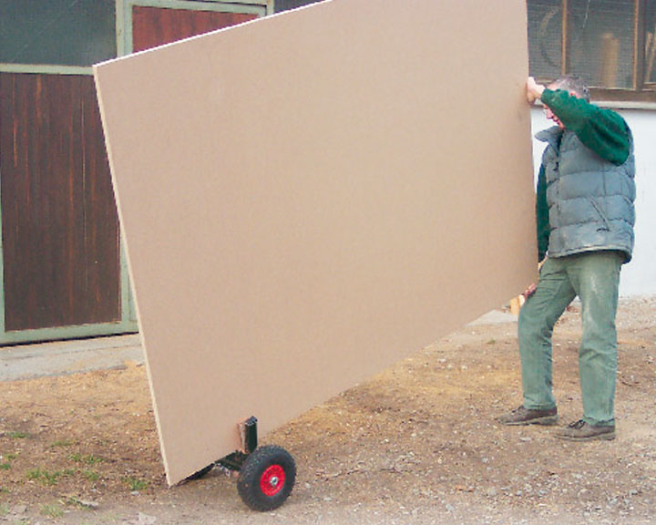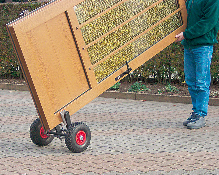 Pomaga przetransportować drzwi, płyty, panele w prosty i bezpieczny sposób. Można jej użyć także jako zacisku stabilizującego do różnych prac, urządzenie trzyma wówczas pewnie element, który możemy poddać obróbce. Specjalna klamra o zasięgu od 6 do 110mm. posiada zabezpieczenie przed zniszczeniem trzymanego elementu. Proste i szybkie użycie. Element do przetransportowania jest trzymany tylko dzięki jego własnemu ciężarowi. Pompowane koła umożliwają transport po wszelkich nawierzchniach, nawet po schodach. Dopuszczalny ciężar elementu to 200kg.