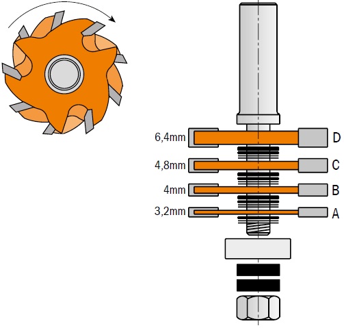 Poszczególne ostrza piłkowe nie powinny się bezpośrednio stykać. Dystans pomiędzy ostrzami powinien wynosić od 1.0 mm do 1.7 mm. Podkładki muszą być używane również między łożyskiem a ostrzami piłkowymi. Możesz skorzystać z zestawu łożysk o symbolu 791.711.00, aby frezować na głębokość 6,35 mm oraz 9,5 mm.